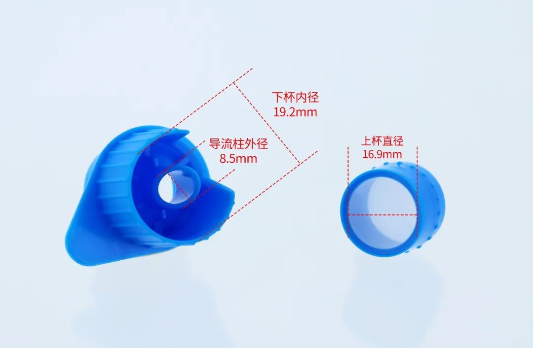 上下杯分体式设计,,,,,,,滤网直径16.9mm,,,,,,,下杯内径19.2mm,,,,,,,导流柱外径8.5mm,,,,,,,适配最小内径大于9mm、最大外径小于19mm的管/瓶口径的1.5mL-15mL离心管、流式管、作育管等