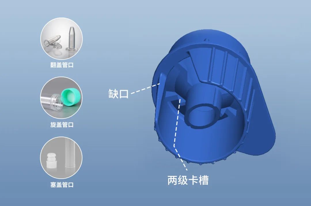 下杯缺口及两级卡槽设计,,,,,,,可稳固适配旋盖、翻盖和塞盖等多种管/瓶口